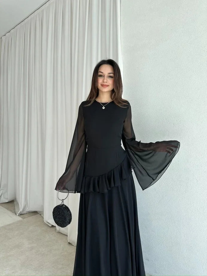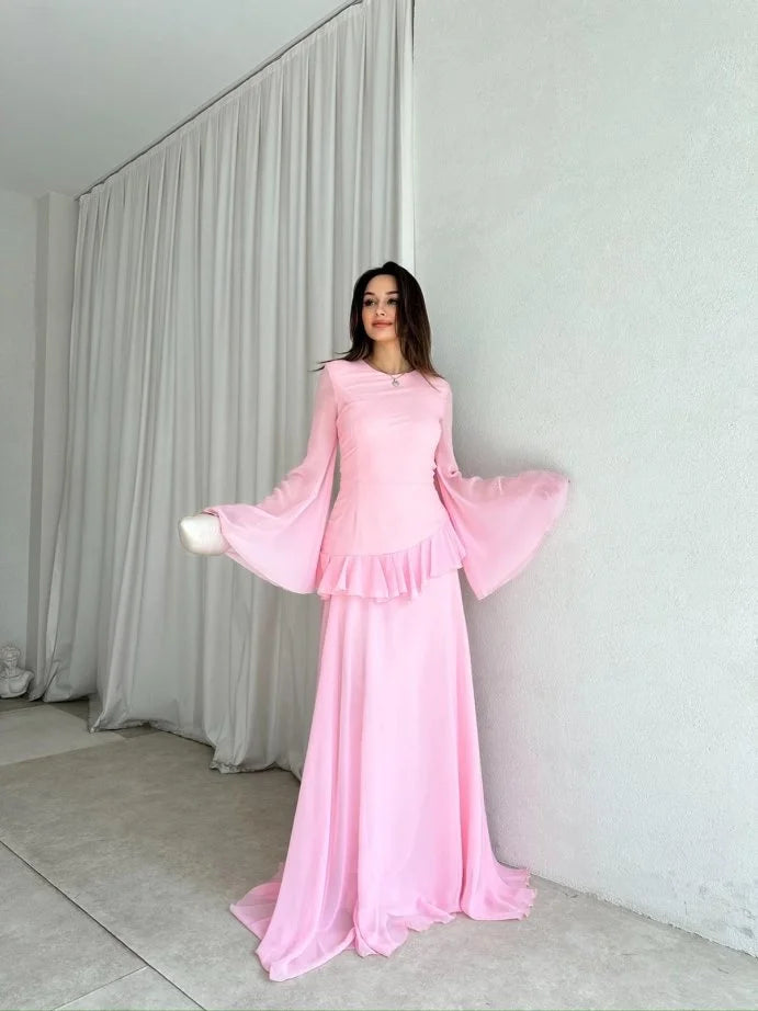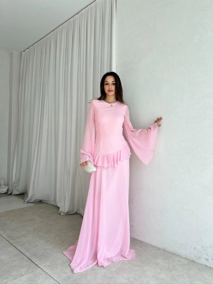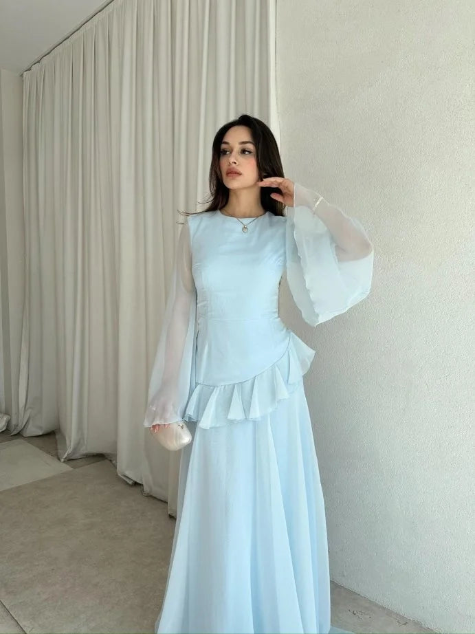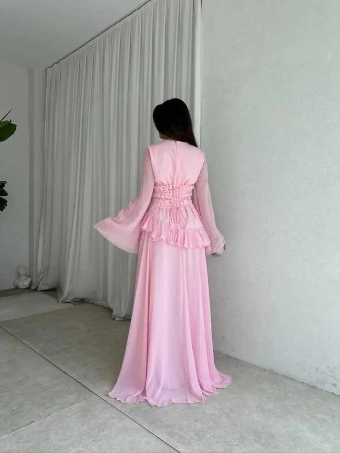 The fitted bodice features a round neckline and dramatic flared sleeves for a touch of vintage romance. A delicate ruffle detail cinches the waist, while the cascading full-length skirt ensures graceful movement with every step. The back is finished with a lace-up corset tie, allowing you to adjust for the perfect fit while adding a subtle statement detail.