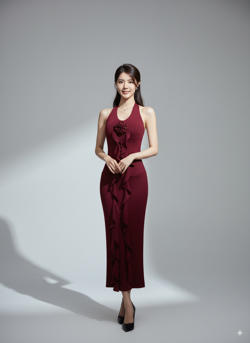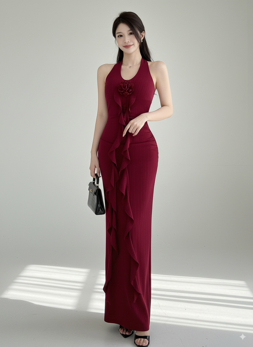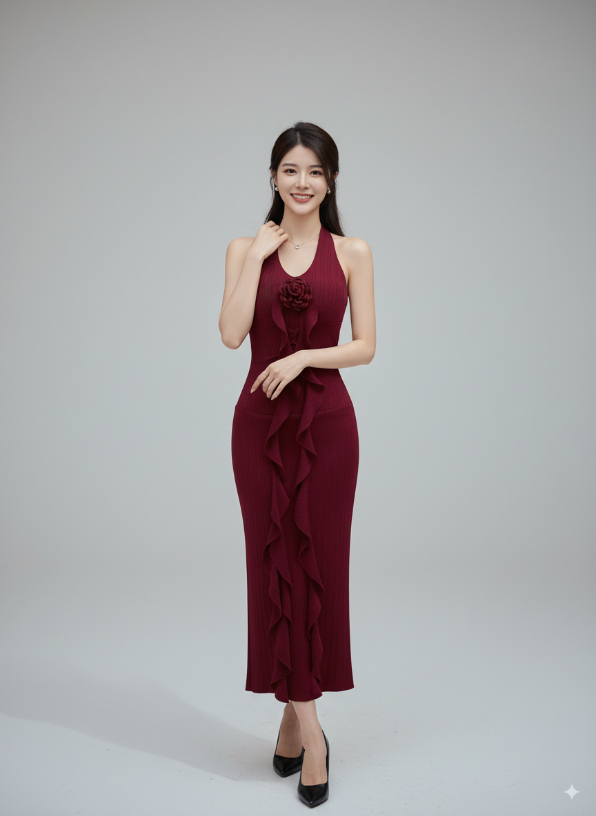 Make an unforgettable statement with this elegant halter neck dress in a deep burgundy shade. Designed to flatter the figure, the dress features a sleek, body-hugging silhouette that flows into a midi length for a sophisticated finish.